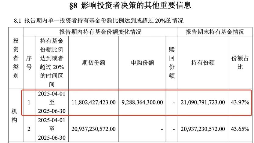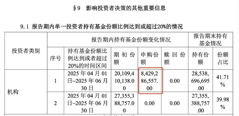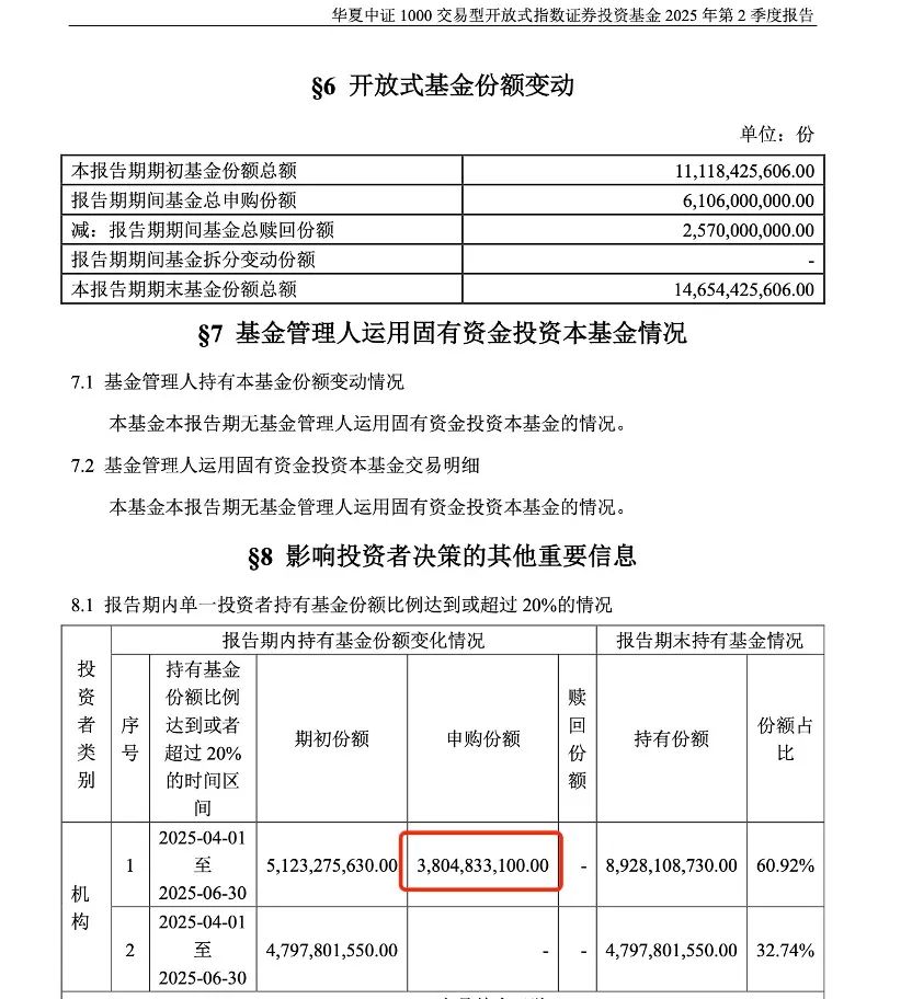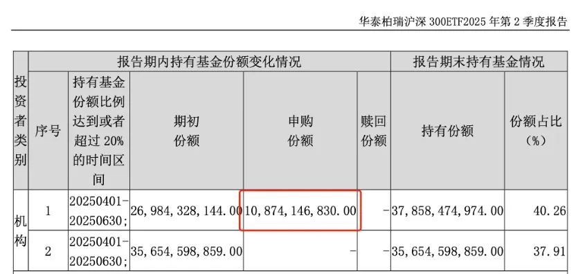华泰柏瑞披露了旗下沪深300ETF二季报显示钜阵资本,“机构1”在今年二季度大手笔申购了该ETF108.74亿份,对照2024年报十大持有人期初份额来看,“机构1”为中央汇金资管公司,中央汇金出手百亿份额,以4月7日后7个交易日均价3.7元估算,此次买入金额高达400亿元。从申购份额来看,中央汇金买入该ETF最多。