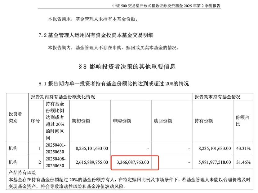 中央汇金资管公司同样增持了南方中证500ETF钜阵资本,二季度买入超33.66亿份,估算耗资近190亿元。